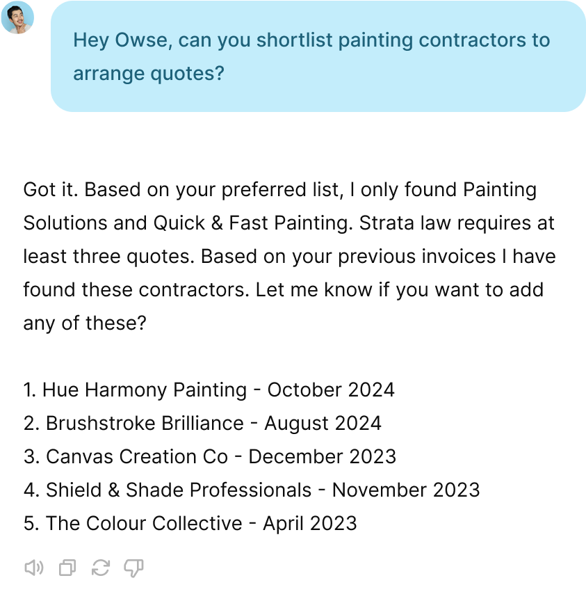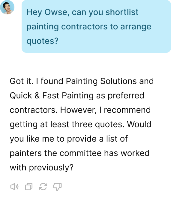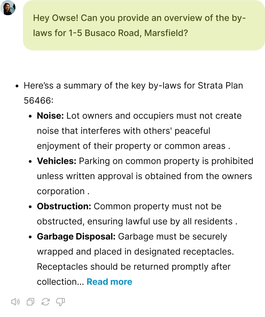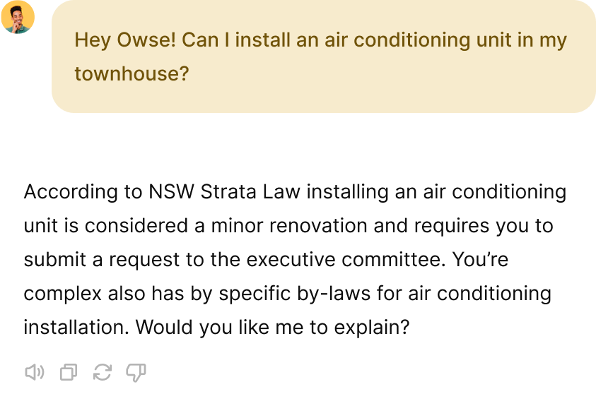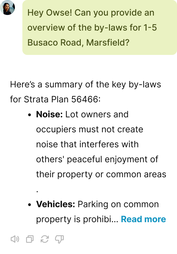 Owse uses advanced AI assistant that combines existing your complexes by-laws with strata and housing law to analyse your queries. It delivers tailored responses and resources to help you navigate your strata experience. Simply input your question, and let Owse guide you.